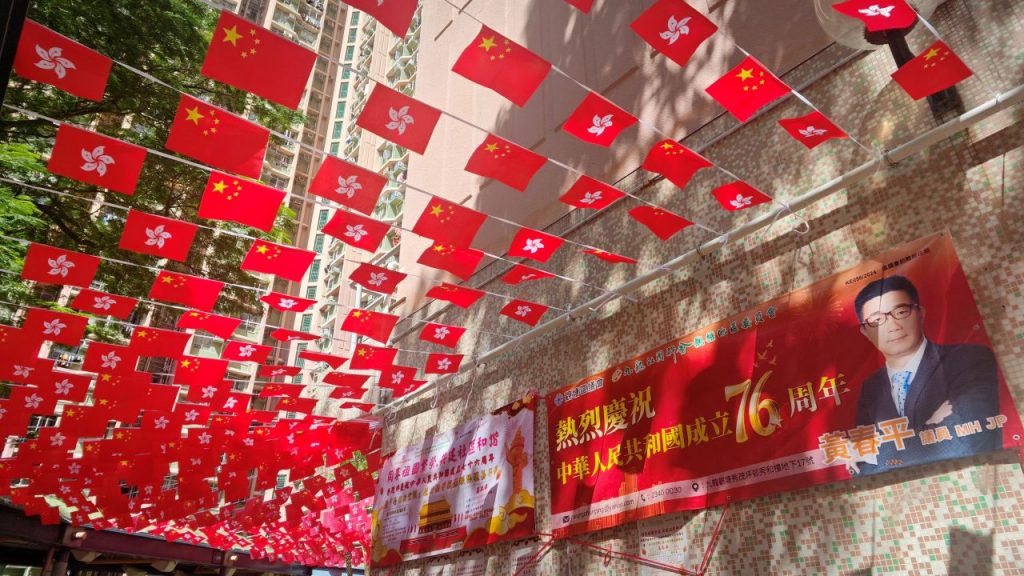 為慶祝中華人民共和國成立 76 周年,九龍社團聯會觀塘地區委員會及屬下屬會在觀塘街邊懸掛起國旗、區旗及彩旗,為國慶佳節增添了濃厚的喜慶氛圍。 觀塘區的街道上彩旗飄飄,鮮艷的五星紅旗在陽光下格外奪目。這些國旗、區旗和彩旗沿著街道整齊排列,形成 …