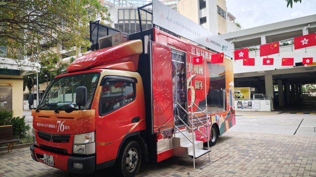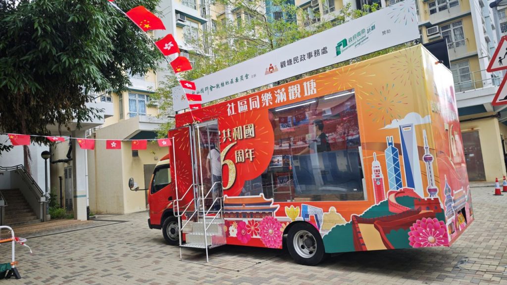 9 月 27日至 10 月 3 日,“社区同乐满观塘 庆祝中华人民共和国成立 76 周年”主题活动在观塘区热烈开展。一辆色彩鲜豔的国庆流动宣传车穿梭于区内各个屋邨,以寓教于乐的互动形式,将喜庆祥和的国庆氛围传递给每位居民,吸引了小朋友、学生及广大市民积极参与。