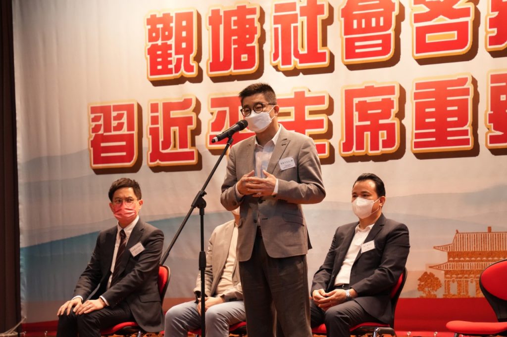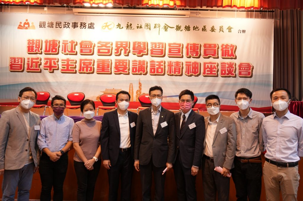座談會上,港區全國人大代表、香港行政會成員、立法會議員吳秋北先生SBS、中央政府駐港聯絡辦九龍工作部祝小東副部長、民政事務處林兆康專員、九龍社團聯會觀塘地區委員會黃春平主任相繼致辭。